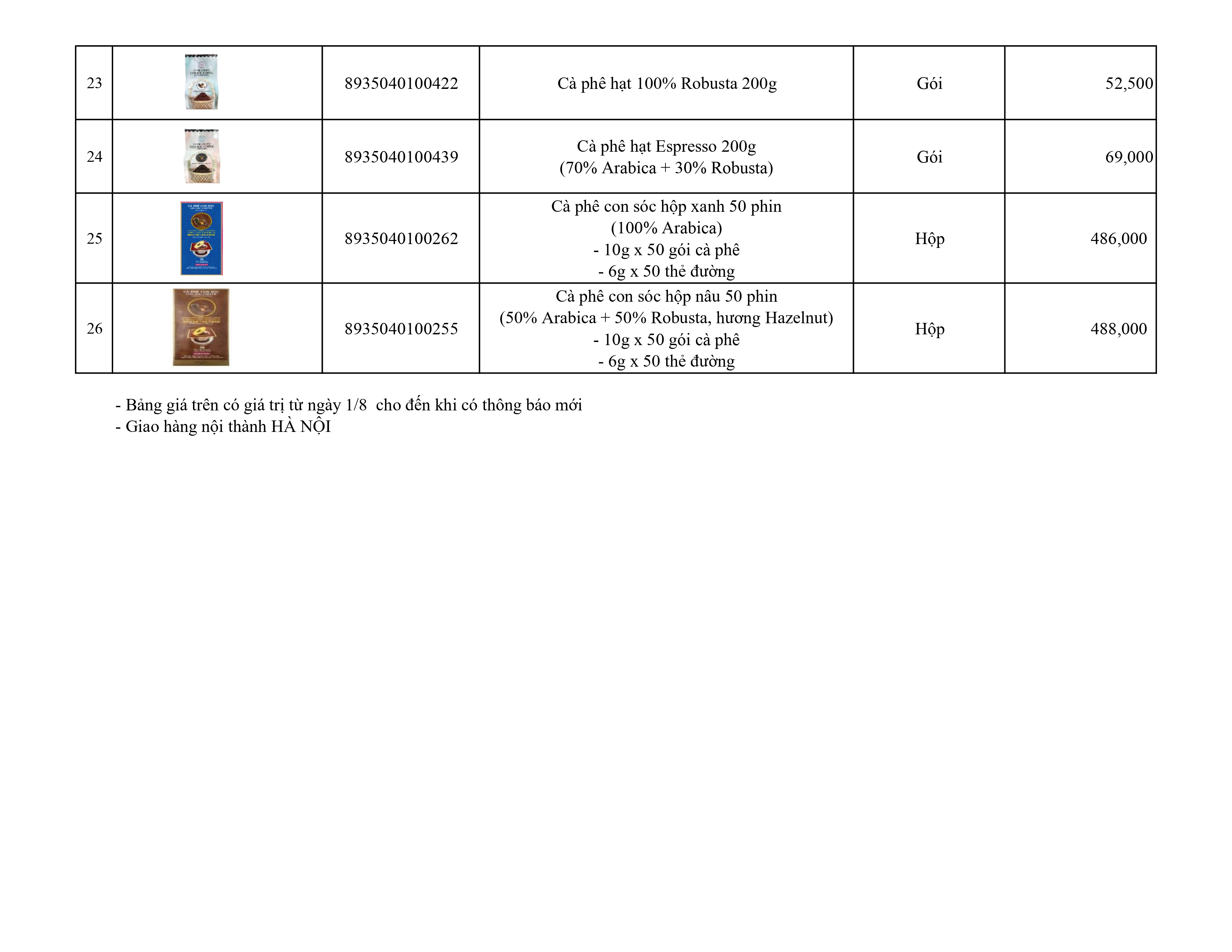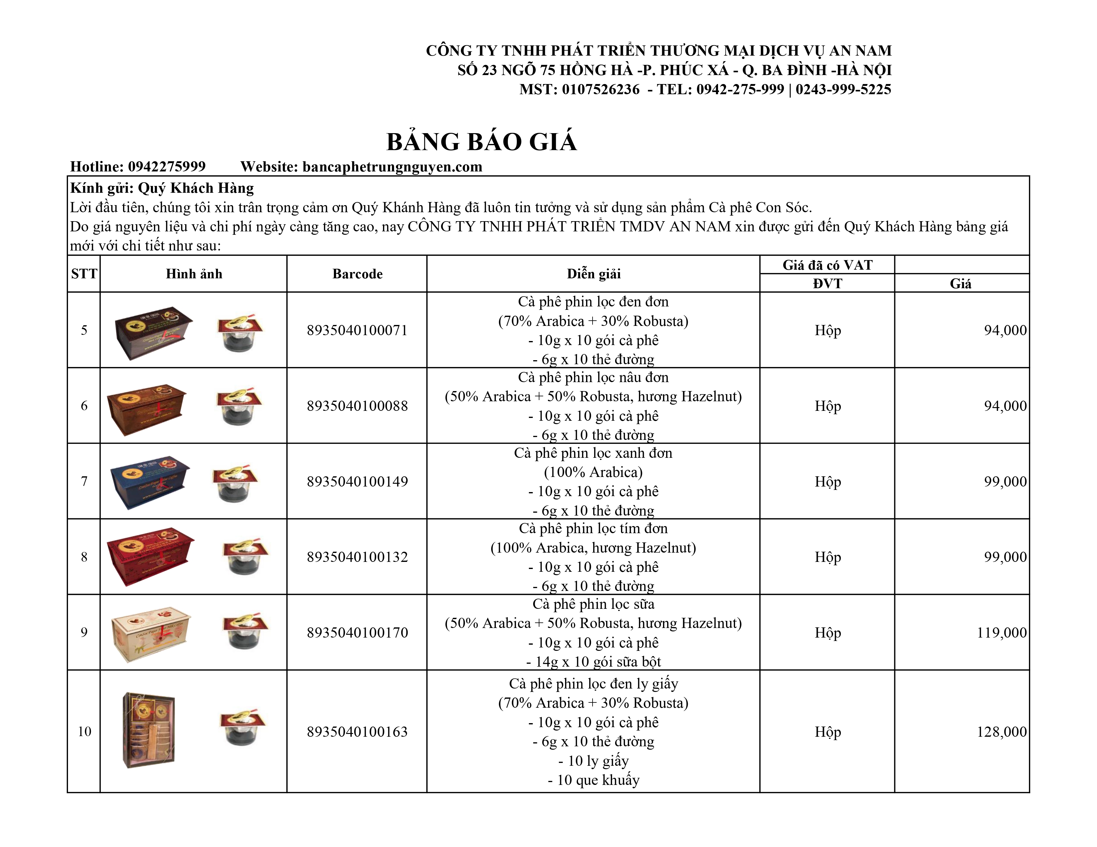 NPP Cà Phê Trung Nguyên xin chân thành cảm ơn sự quan tâm của Quý Khách Hàng tới sản phẩm của chúng tôi. Dưới đây chúng tôi xin gửi tới Quý Khách Hàng Báo giá sản phẩm Cà phê Con Sóc.