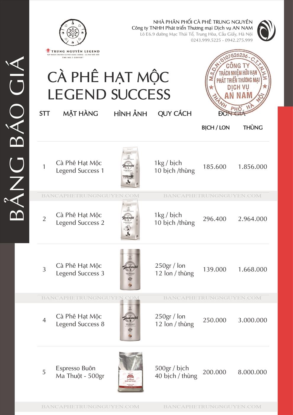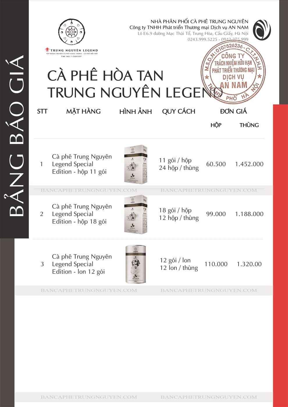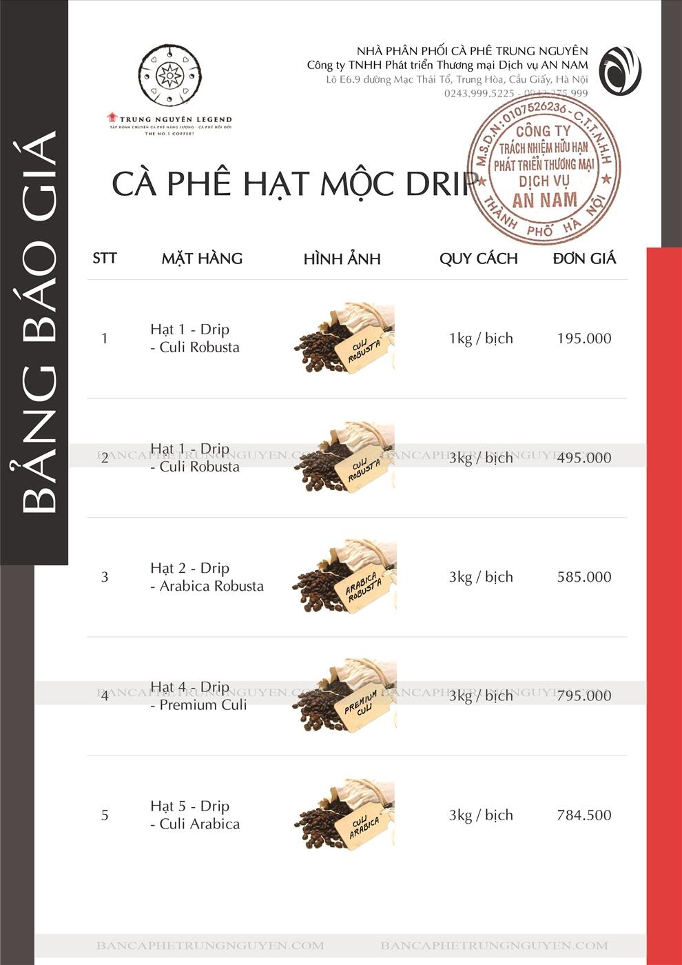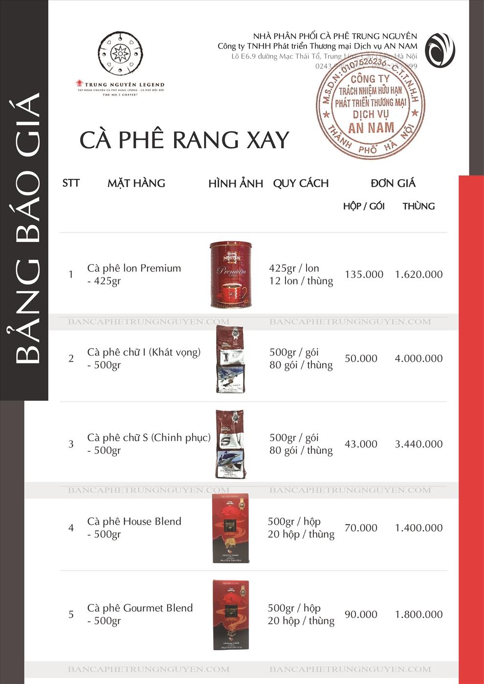 BẢNG BÁO GIÁ CÀ PHÊ TRUNG NGUYÊN 2019