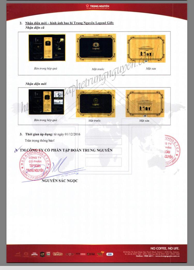 V/v : THAY ĐỔI NHẬN DIỆN LOGO TRUNG NGUYÊN LEGEND 225, LEGEND GIFT VÀ CƠ CẤU BÊN TRONG HỘP LEGEND GIFT